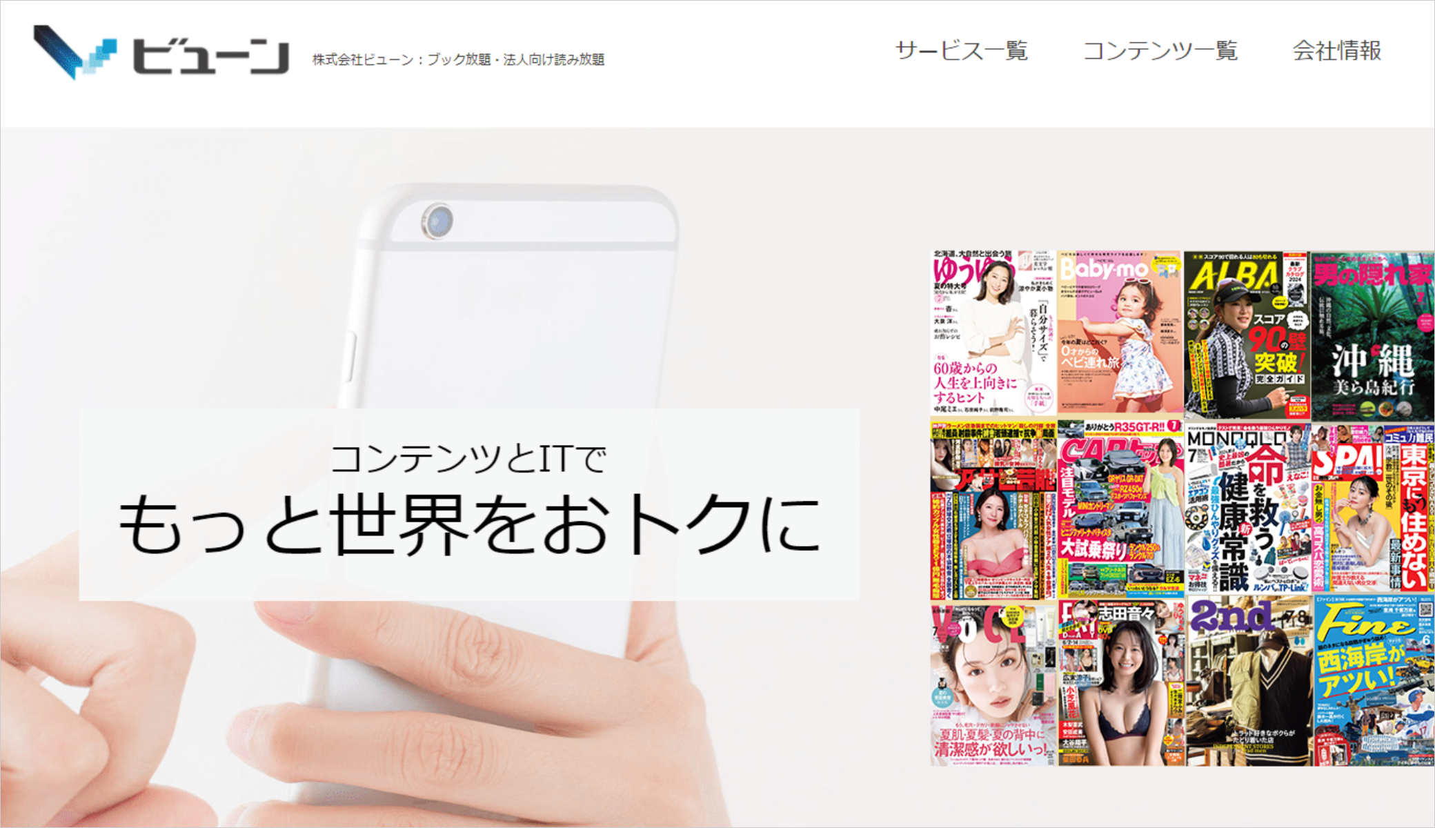 現在は、個人向け電子書籍サービス「ブック放題」や、法人向け電子書籍サービス「ビューン読み放題スポット」、「ビューン読み放題マンション」など、読み放題の対象を雑誌だけでなくマンガや旅行ガイドにも広げ、雑誌800誌・旅行ガイド250冊・漫画60,000冊以上の電子書籍が読み放題となっています。