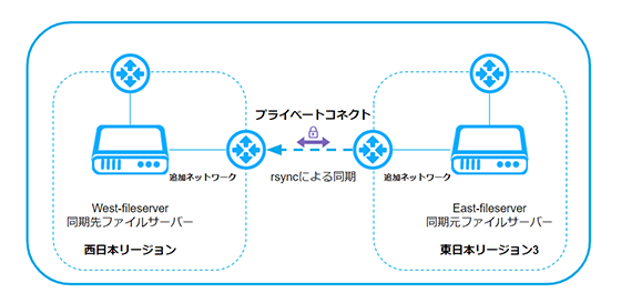 そして、東日本リージョン3と西日本リージョンそれぞれでネットワークを追加し、プライべートコネクトで接続し、rsyncで定期的にファイルサーバーのデータ同期を行います。