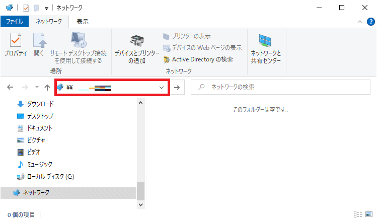 エクスプローラーを開いてアドレスバーに「\\サーバーのパブリックIPアドレス」を入力して実行します。(図はWindows10の例)