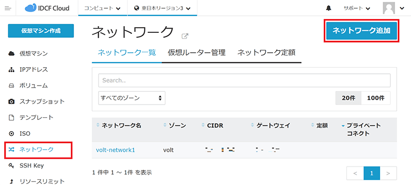 3. 左メニューより[ネットワーク]をクリックし、ネットワーク一覧画面にて、[ネットワーク追加]をクリックします。