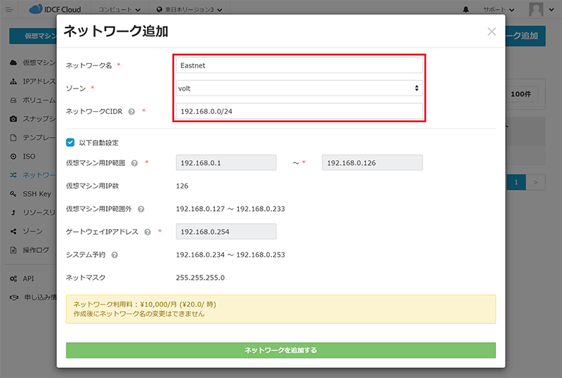 | 東日本リージョン3の追加ネットワーク名 | Eastnet | |