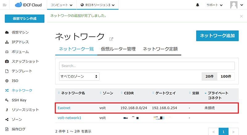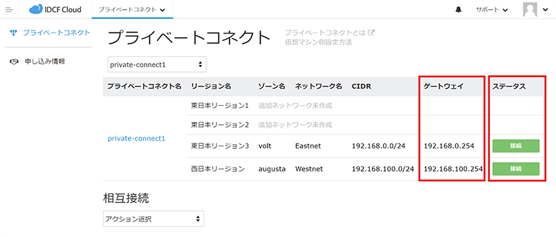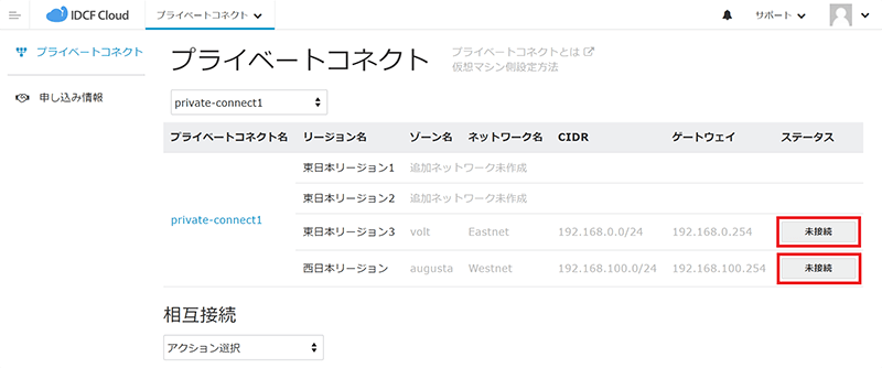 2. プライベートコネクト画面にて、前章までに各リージョンで追加したネットワーク名が表示されていることを確認し、それぞれのネットワークのステータス[未接続]をクリックします。