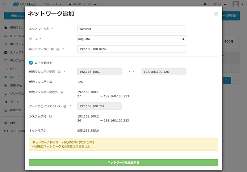 | 西日本リージョンの追加ネットワークCIDR | 192.168.100.0/24 | |