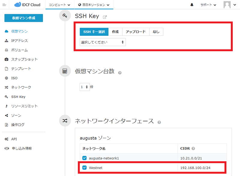 ※注1: SSH Keyの項目は、SSH秘密鍵を未作成の場合は[作成]を選択し、生成された秘密鍵をローカルPCに保存します。詳しくは「めちゃ楽ガイド」6ページの手順3をご参照ください。