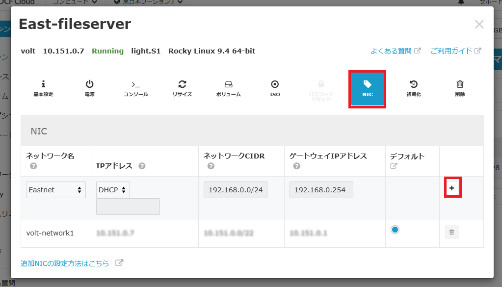NIC設定画面で、ネットワーク名として手順4で追加したネットワーク名が表示されていること、IPアドレスとしてDHCPが選択されていることを確認し、[+]をクリックします。