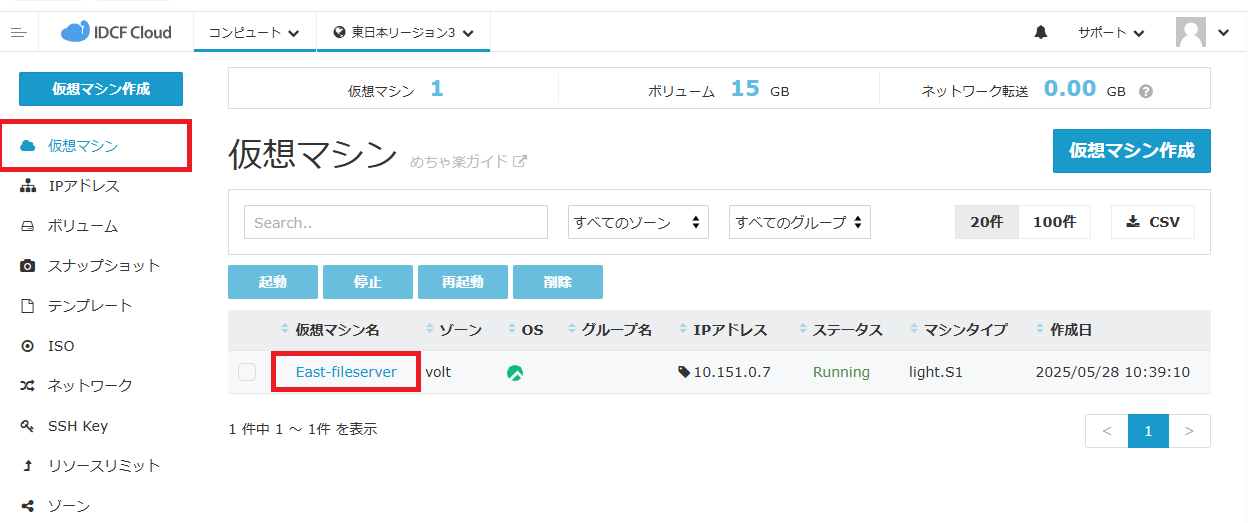 6. 左メニューより[仮想マシン]をクリックし、作成した仮想マシン名[East-fileserver]をクリックします。