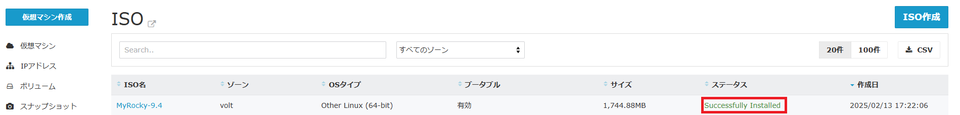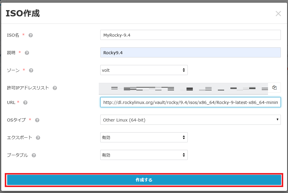 | ゾーン | ISOイメージをインポートしたゾーンを指定(今回はvoltを指定) | |