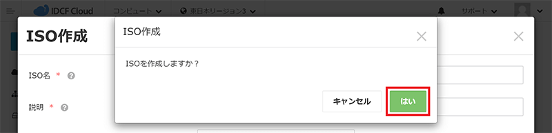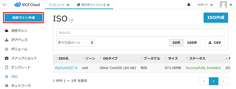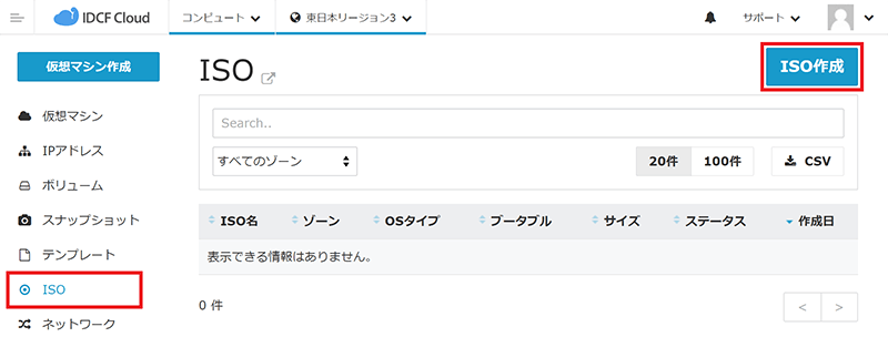 1. コンピュートのメニューより[ISO]をクリックし、ISO一覧画面にて[ISO作成]をクリックします。