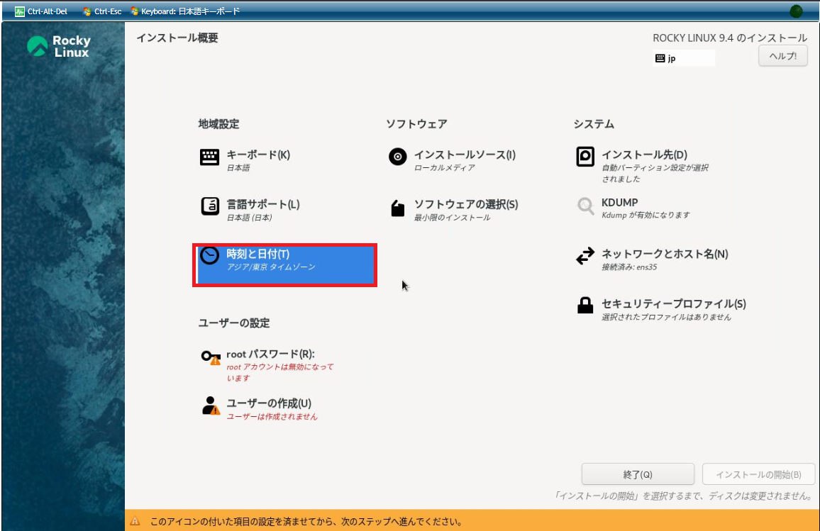 14. 「インストールの概要」画面に戻ります。画面右のスクロールバーを使って、画面をスクロールし、上部の[日付と時刻]をクリックします。