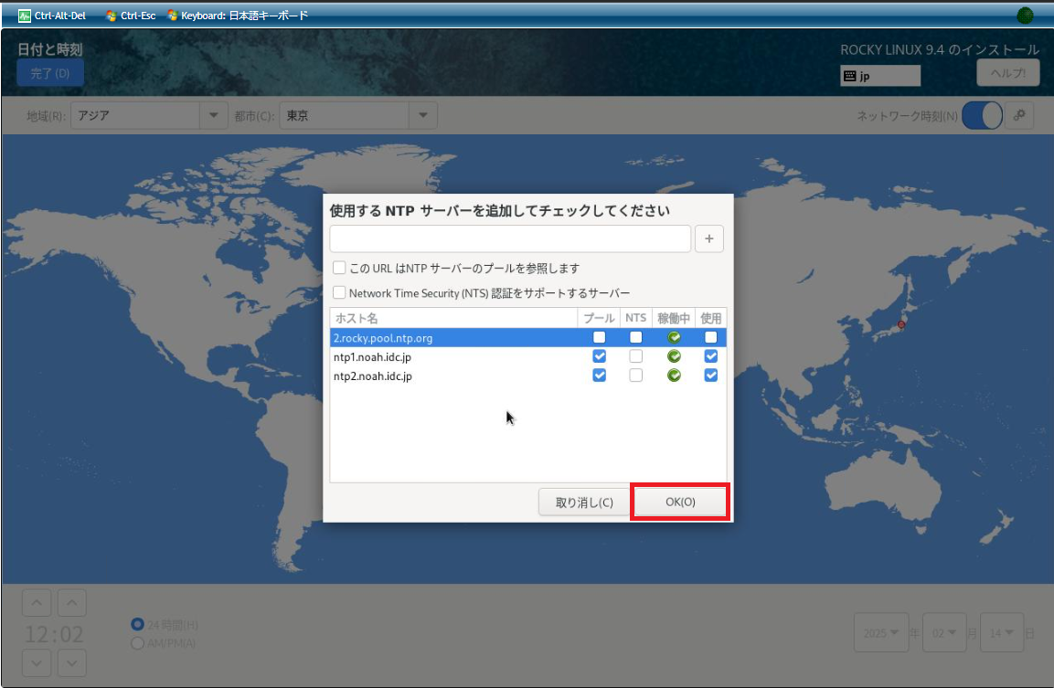IDCFクラウドにて提供しているNTPサーバー「ntp1.noah.idc.jp、ntp2.noah.idc.jp」を登録し、以下のように[使用]にチェックしてください。設定後[OK]をクリックします。