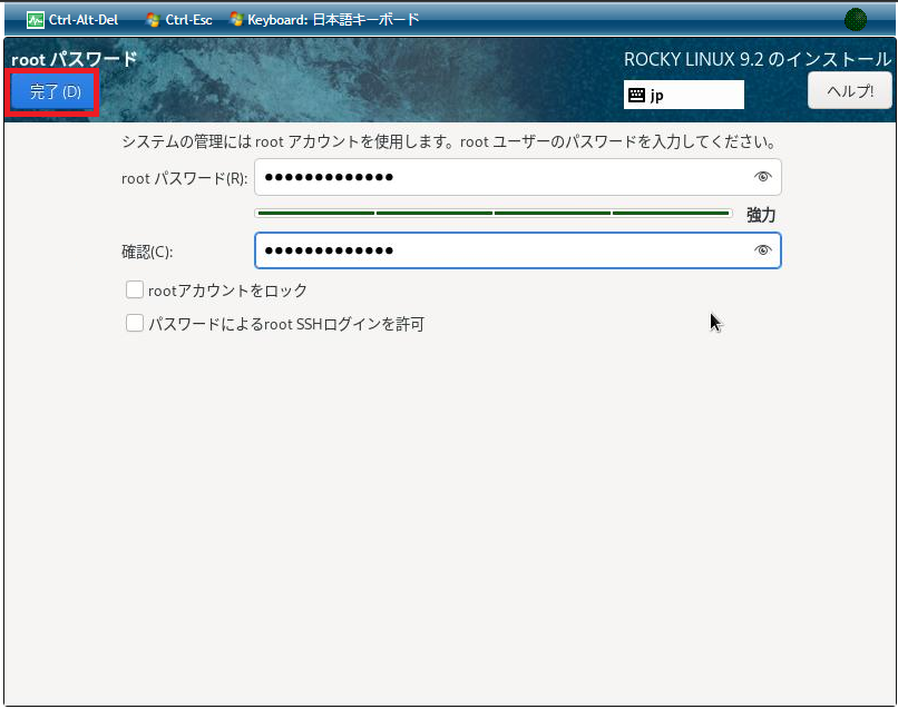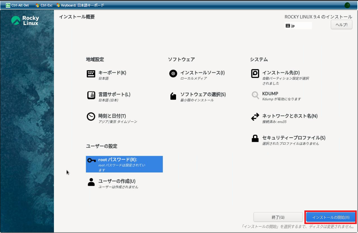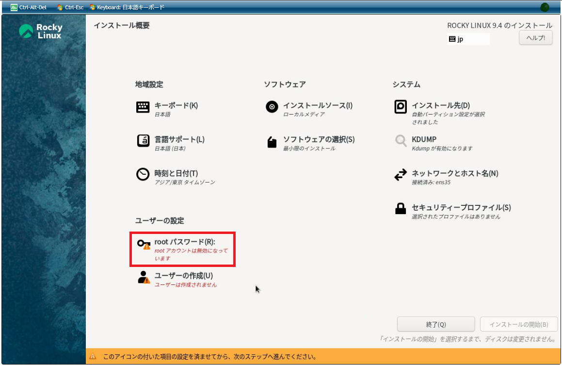 17. [完了]をクリックし、「インストールの概要」に戻ります。[ROOTパスワード]をクリックします。