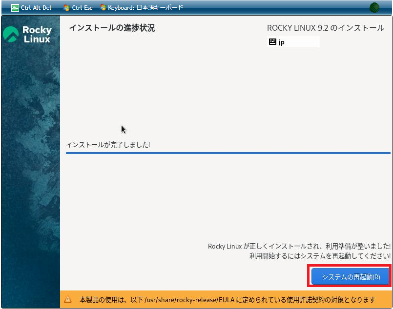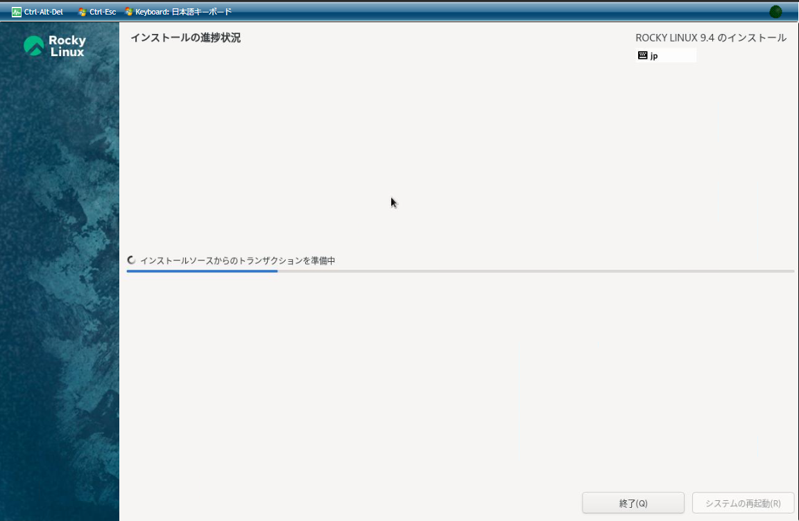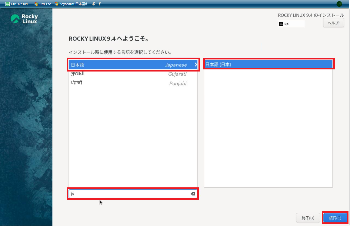8. Rocky Linuxのウェルカム画面が表示されます。左下の検索窓に「ja」を入力し、[日本語]-[日本語(日本)]を選択し、[続行]をクリックします。