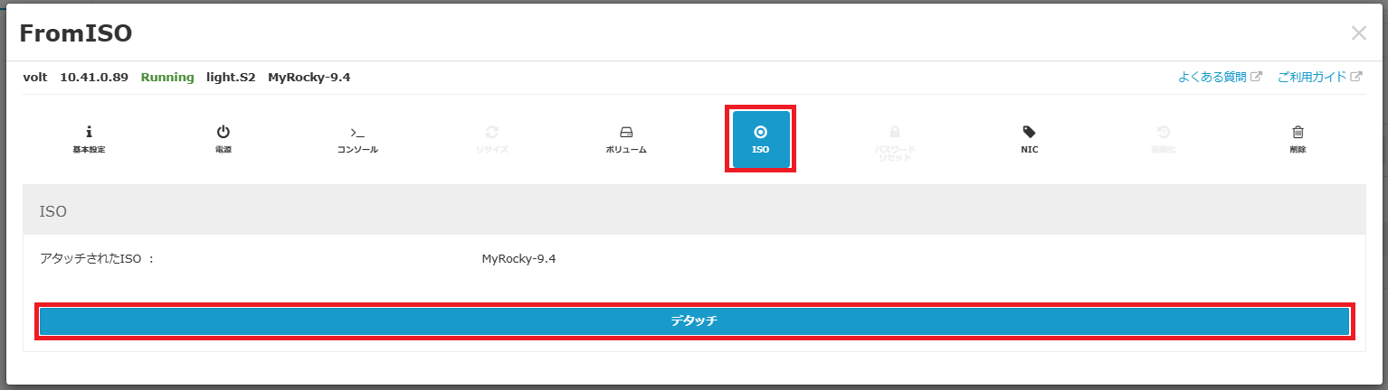 23.仮想マシン詳細画面より、[ISO]タブをクリックし[デタッチ]をクリックします。