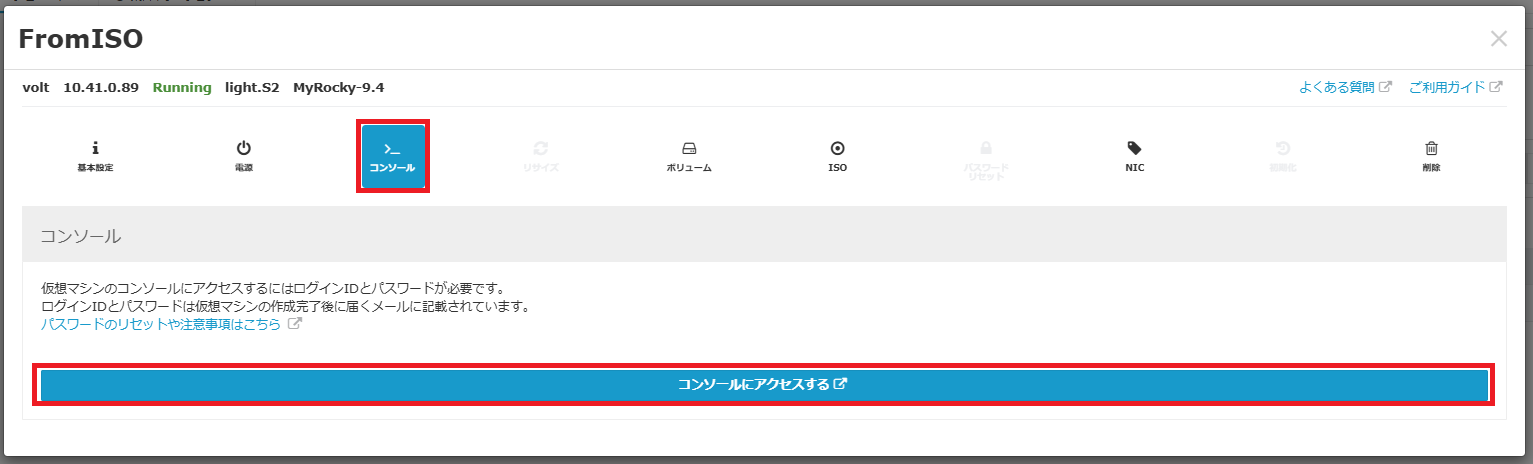 6. 仮想マシン詳細画面にて[コンソール]タブをクリックし、[コンソールにアクセスする]をクリックします。