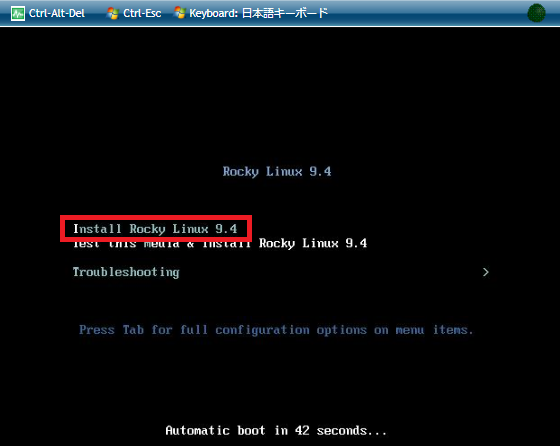 画面上をクリックしてウィンドウをアクティブにし、以下の画面になっていればキーボードの上下の矢印キーで[Install Rocky Linux 9.4]を選択し、Enterキーを押下します。