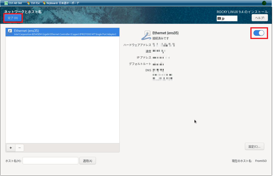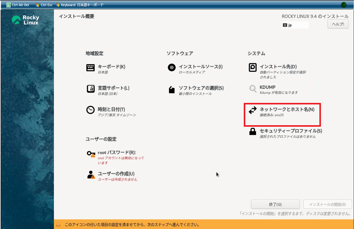 12. 「インストールの概要」画面に戻ります。[ネットワークとホスト名]をクリックします。