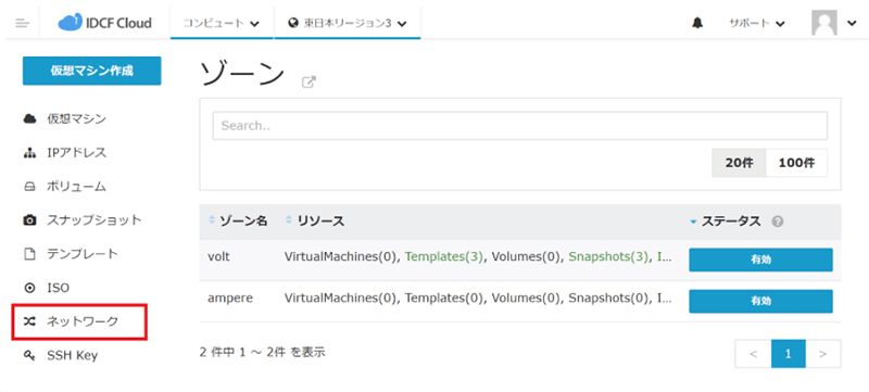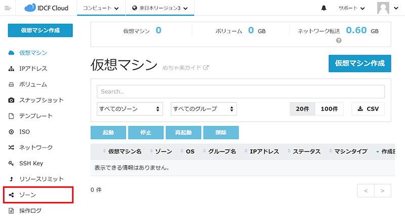 1. クラウドコンソールにログインし、東日本リージョン3のコンピュートのメニューより[ゾーン]をクリックします。