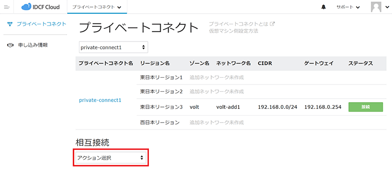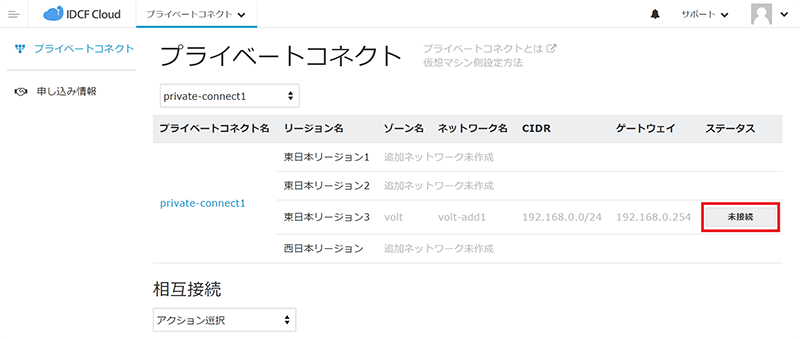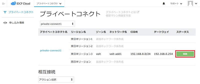 11. プライベートコネクト一覧画面にて、接続対象のネットワークのステータスが「接続」となっていることを確認します。
