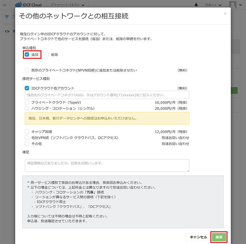 ※同一接続サービス種別で、接続先(IDCFクラウド他アカウント、回線番号など)が複数ある場合は、それぞれに対して本申し込みを実施してください。