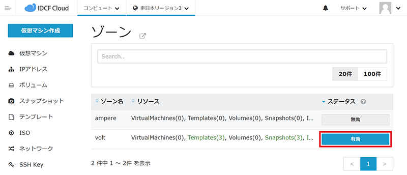 2. ゾーン一覧画面にて、対象のゾーン(volt)のステータスが「有効」になっていることを確認します。