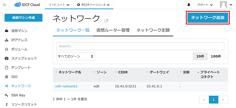 4. ネットワーク一覧画面にて、[ネットワーク追加]をクリックします。