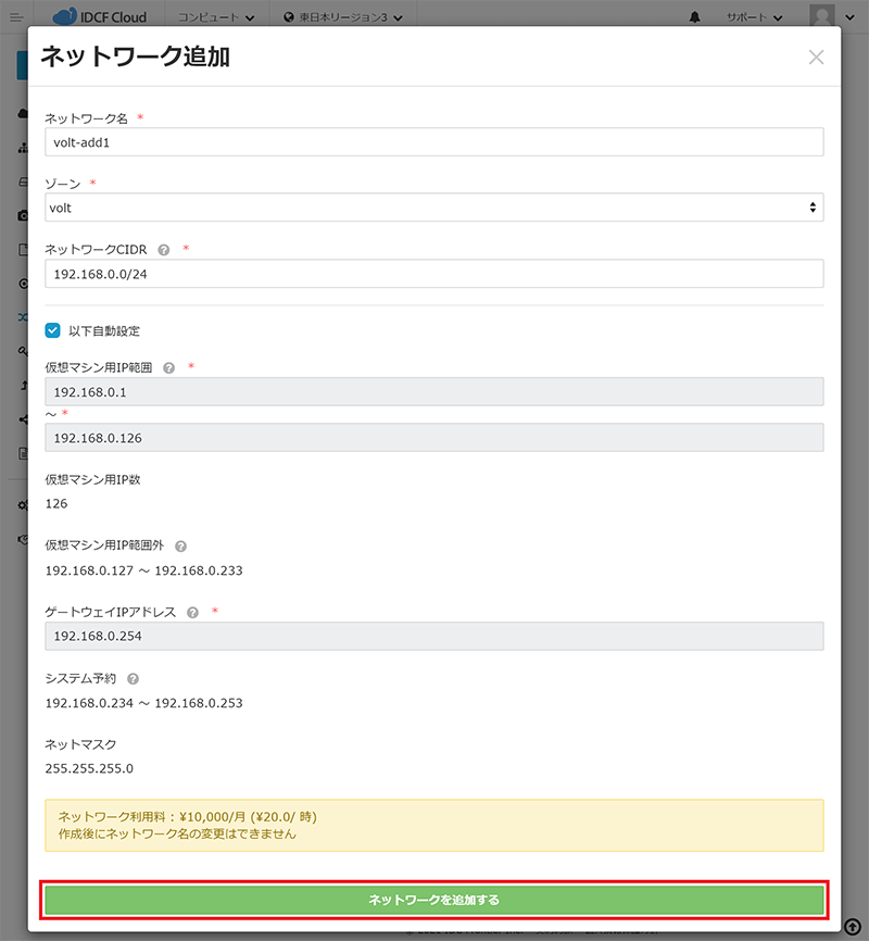 5. ネットワーク追加画面にて設定を入力し、最後に[ネットワークを追加する]をクリックします。