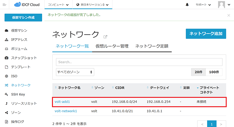 6. ネットワーク一覧画面にて、追加したネットワークを確認します。