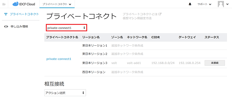 8. プライベートコネクト一覧画面にて、対象のプライベートコネクトを選択します。