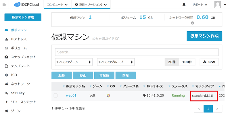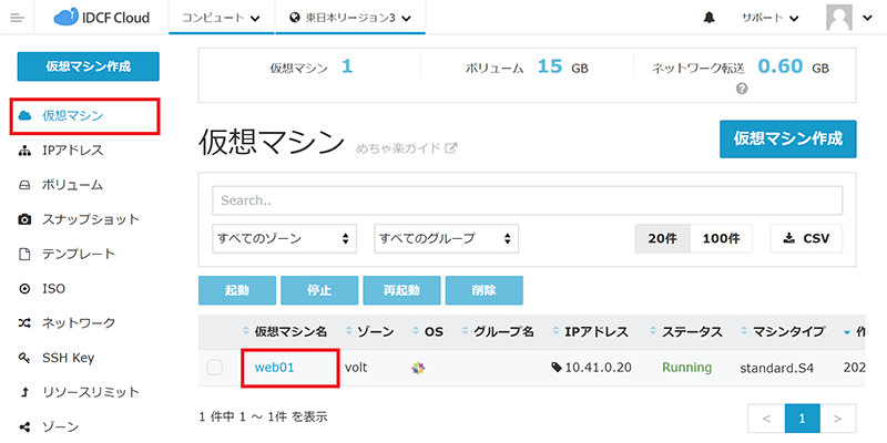 1. クラウドコンソールのコンピュートのメニューより[仮想マシン]をクリックし、対象の仮想マシン名をクリックします。