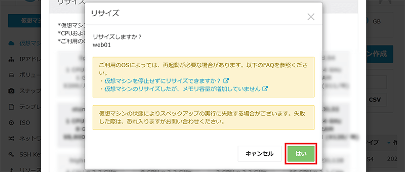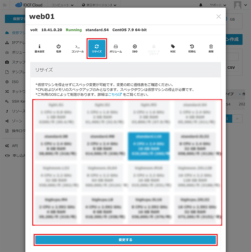2. [リサイズ]タブを選択後、ご希望のマシンスペックを選択し、[変更する]をクリックします。