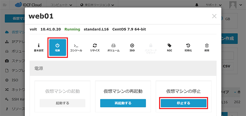 仮想マシンを停止する場合は対象の仮想マシン詳細画面の[電源]タブを選択し、[停止する]をクリックします。