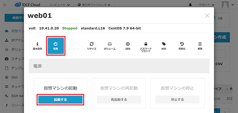 仮想マシンを起動する場合は対象の仮想マシン詳細画面の[電源]タブを選択し、[起動する]をクリックします。