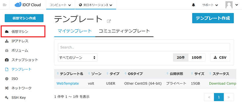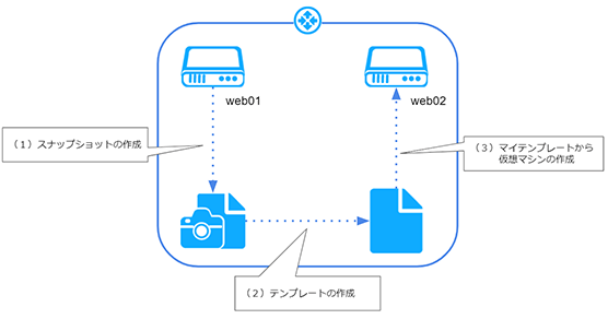 手順「1. スナップショットの作成」で作成したスナップショットからテンプレートを作成します。