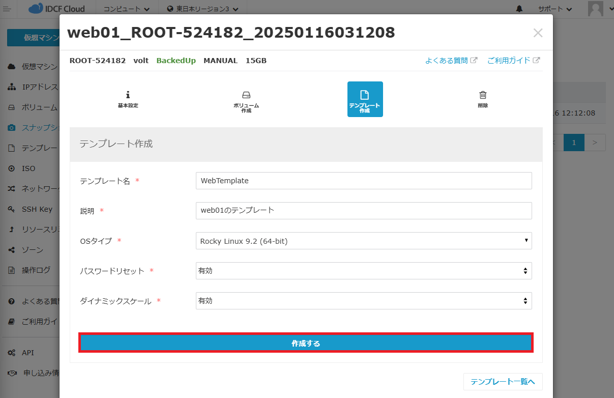 2. スナップショット詳細画面にて[テンプレート作成]をクリックします。