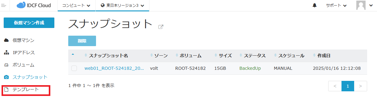 1. 左メニューから[スナップショット]をクリックし、スナップショット一覧より、上記手順で作成したスナップショットの「スナップショット名」をクリックします。