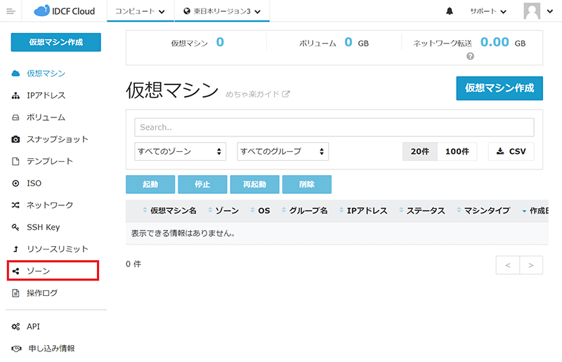 1. クラウドコンソールにログイン後、コンピュートのメニューより[ゾーン]をクリックします。