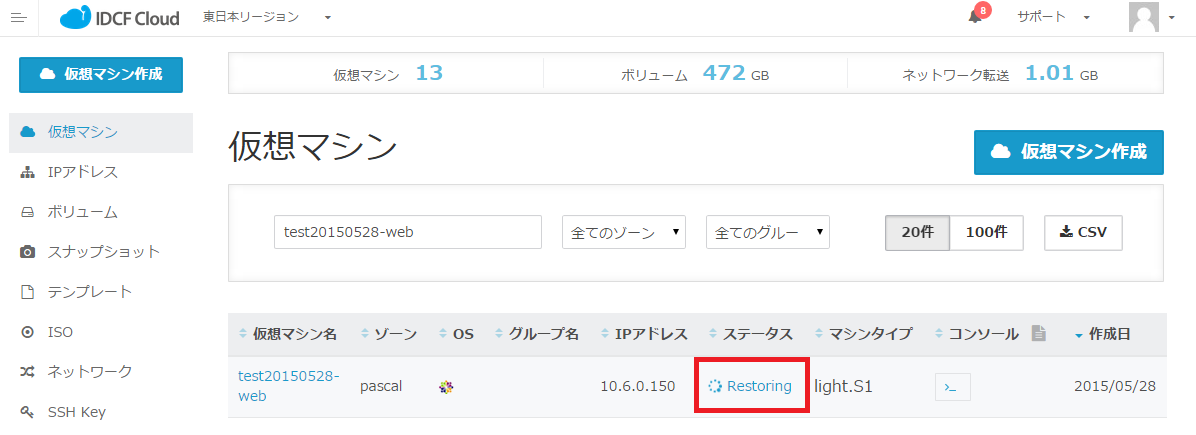 4.仮想マシン一覧ページで、ステータスが「Restoring」から「Running」になることを確認してください。初期化の完了です。
