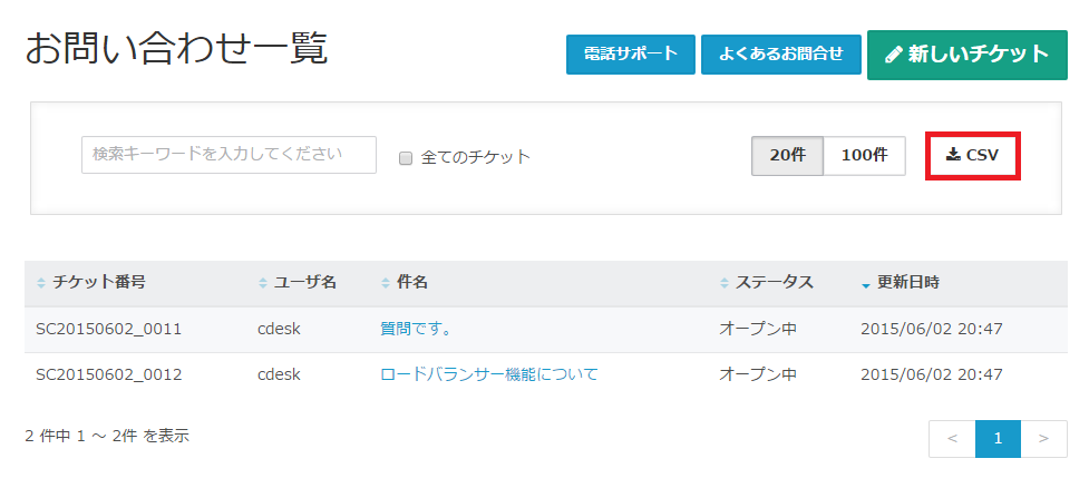 お問い合わせ一覧画面の右上「CSV」をクリックし、ダウンロードしてください。