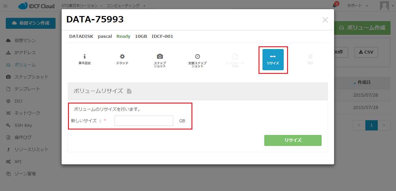 ボリュームダイアログから「リサイズ」をクリックし、ボリュームの新しいサイズを入力してください。