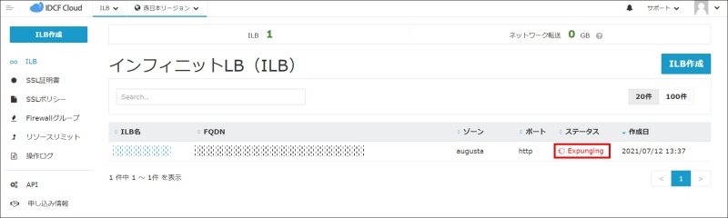 3. 一覧画面が表示され、対象のインフィニットLBのステータスがExpungingとなります。その後削除が完了すると一覧から対象のロードバランサーの表示がなくなります。