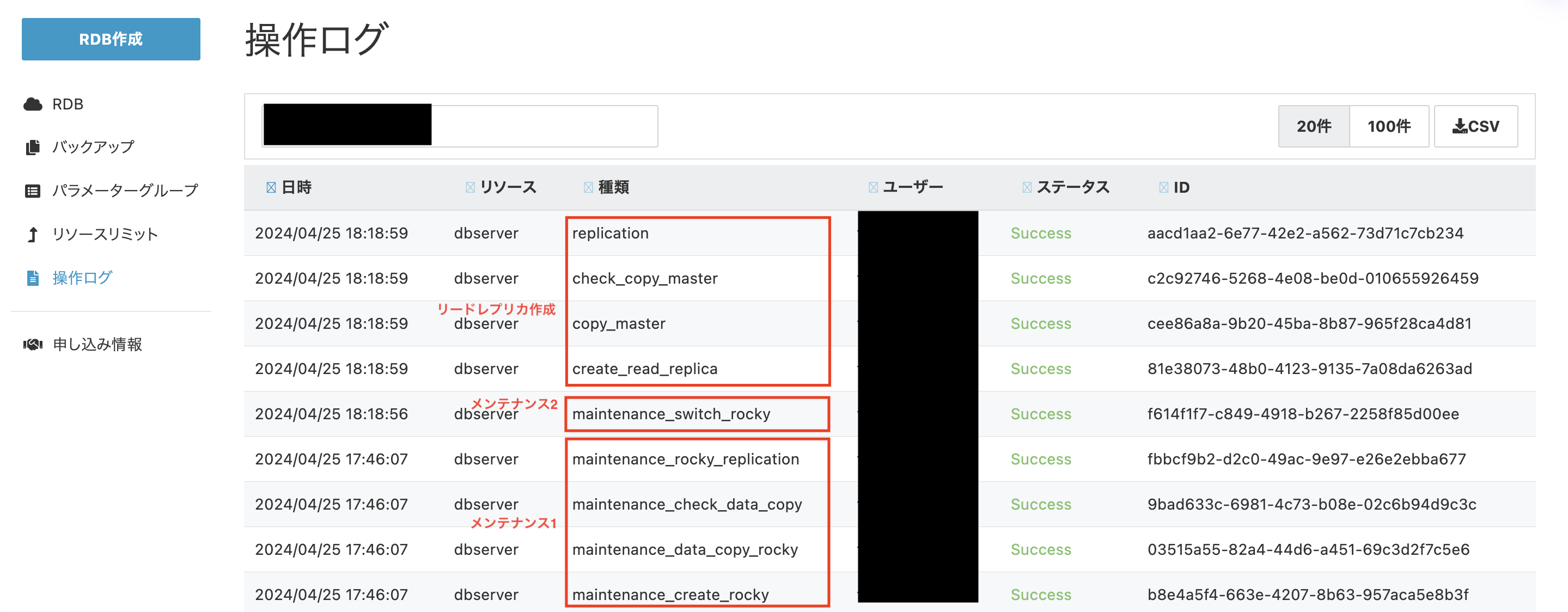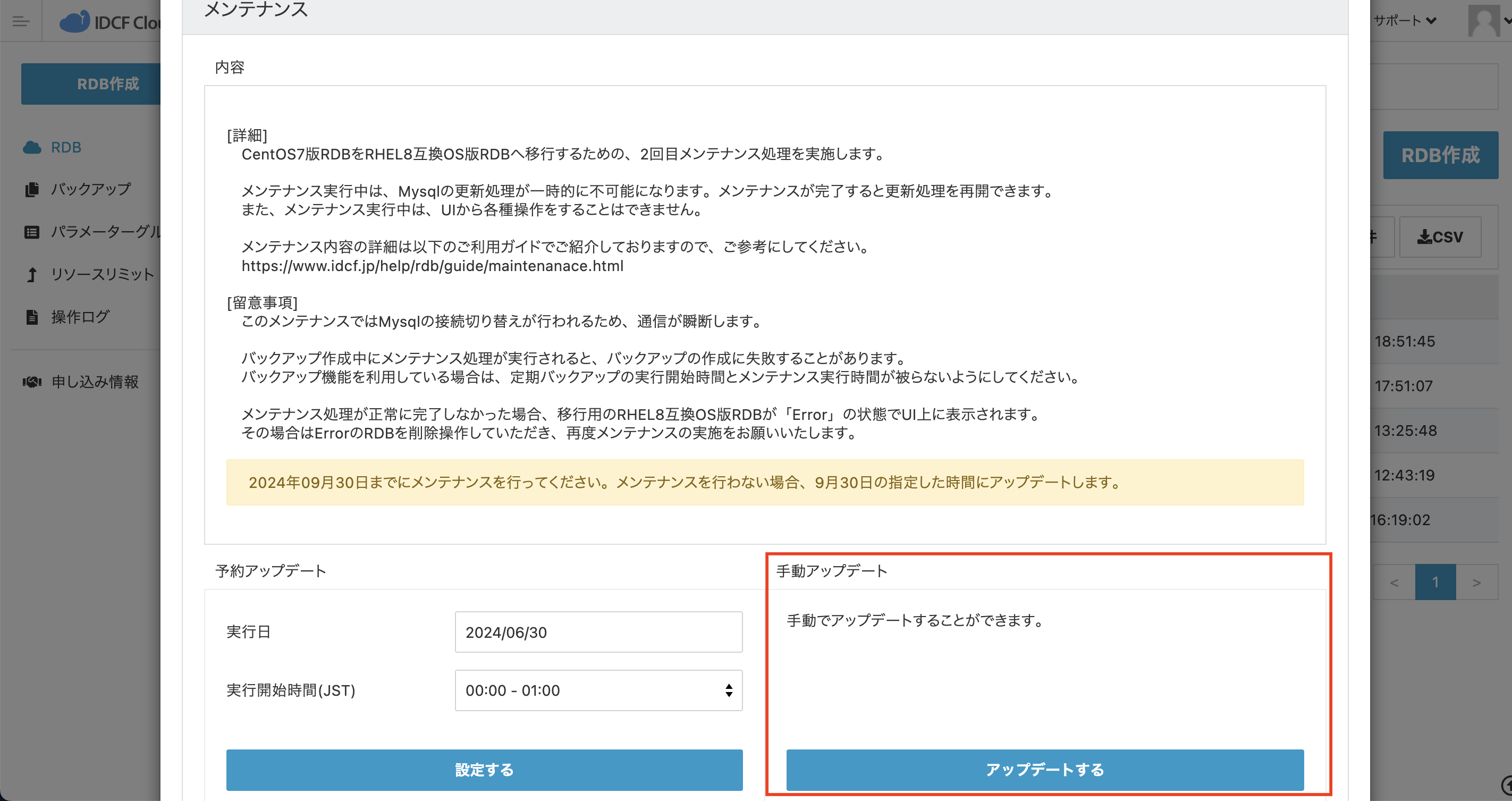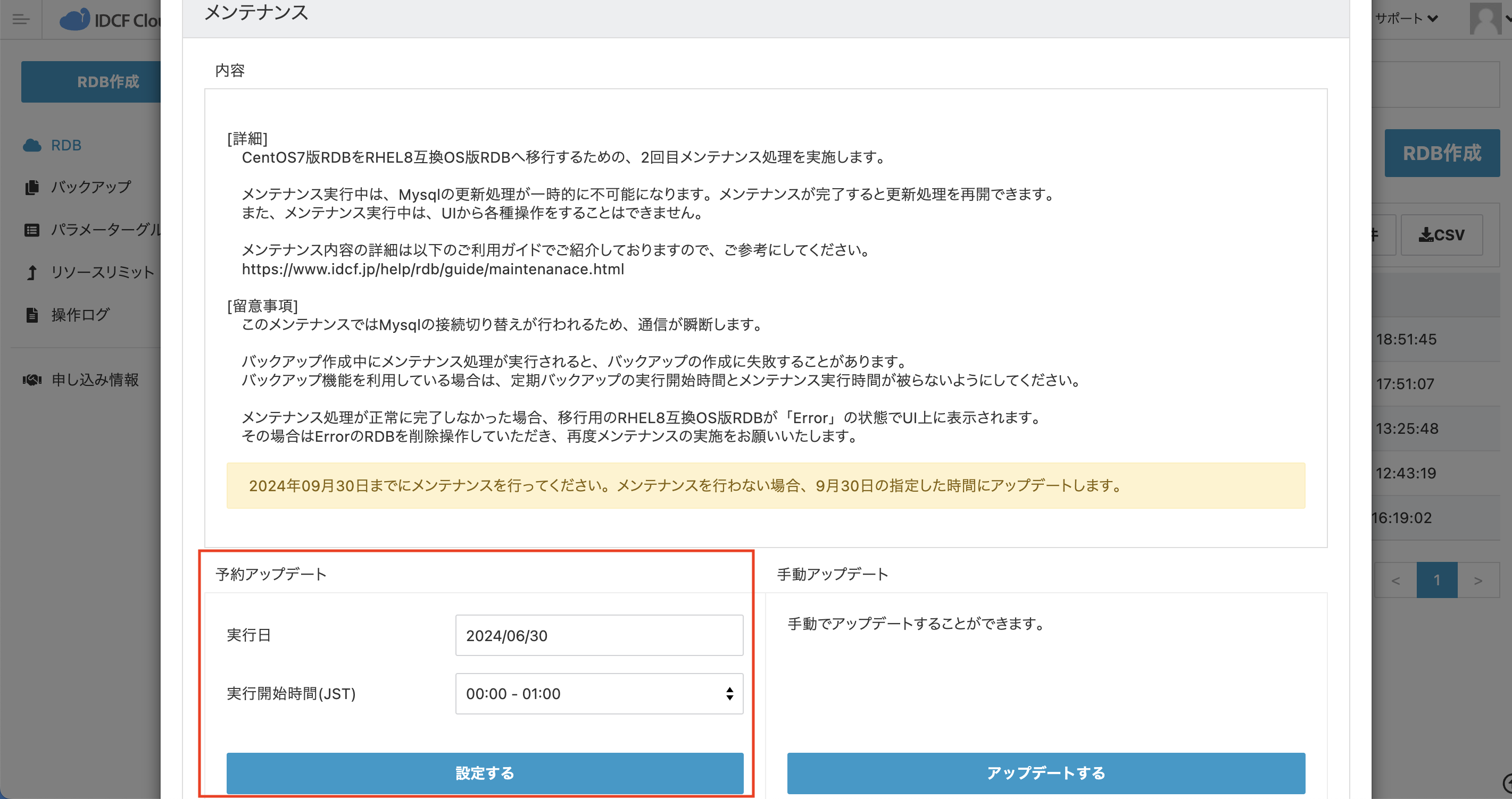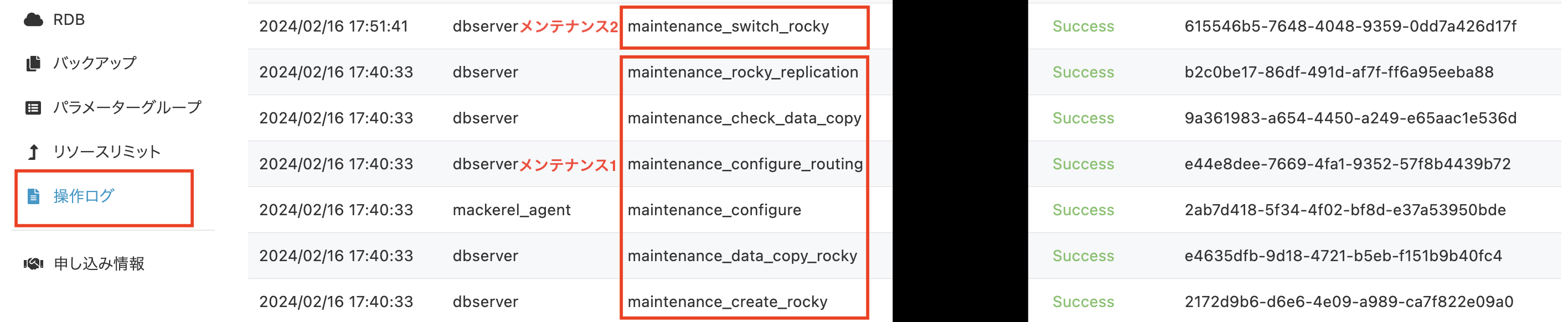 ※ メンテナンス1の開始後からメンテナンス2が完了するまではクラウドコンソールからRDBの変更は行わないでください。