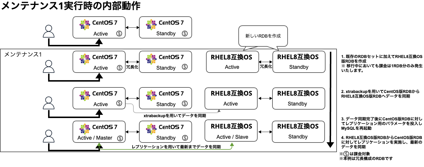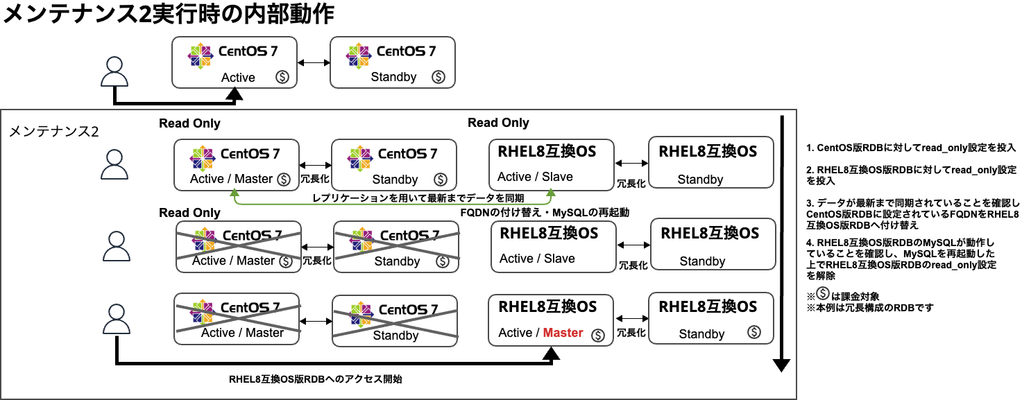 4. メンテナンスが実施されると即時にRHEL8互換OS版RDBが作成され、データの同期が完了すると2つ目のメンテナンスを実施可能となります。