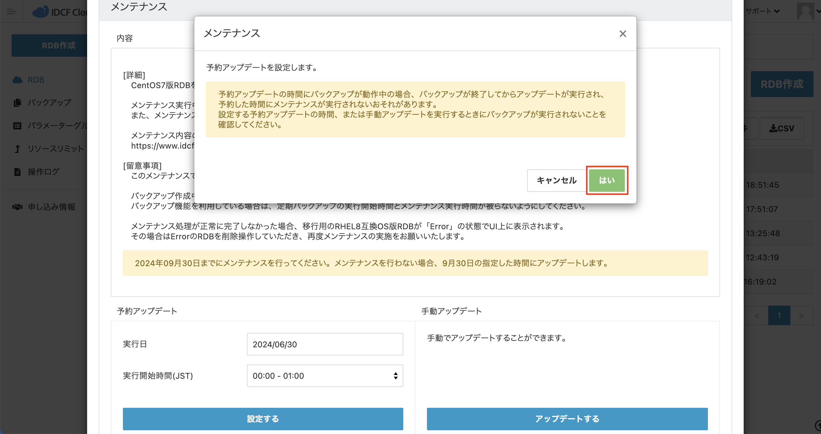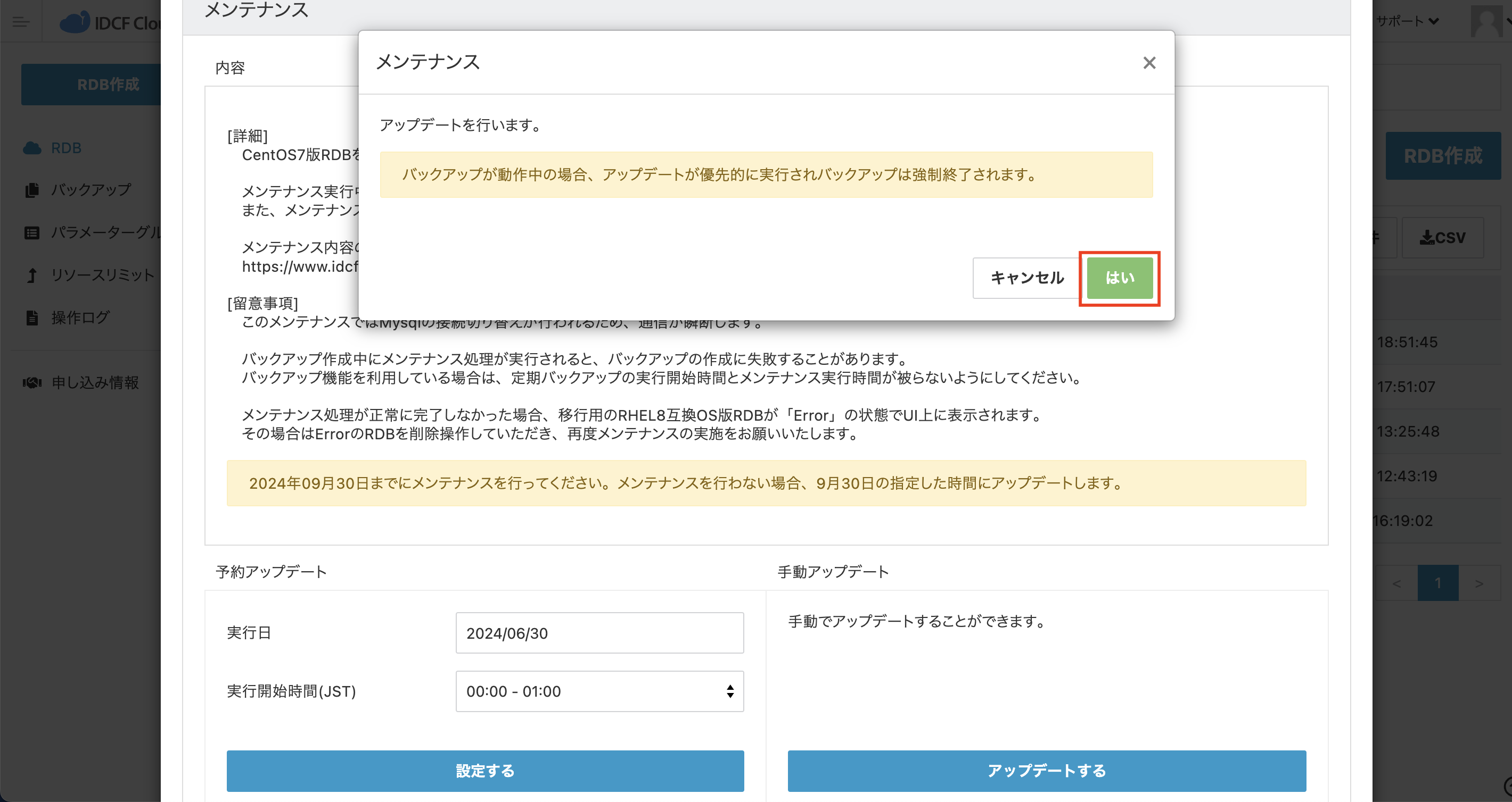 3. メンテナンス実行時の注意事項を確認し、問題がなければ「はい」をクリックします。