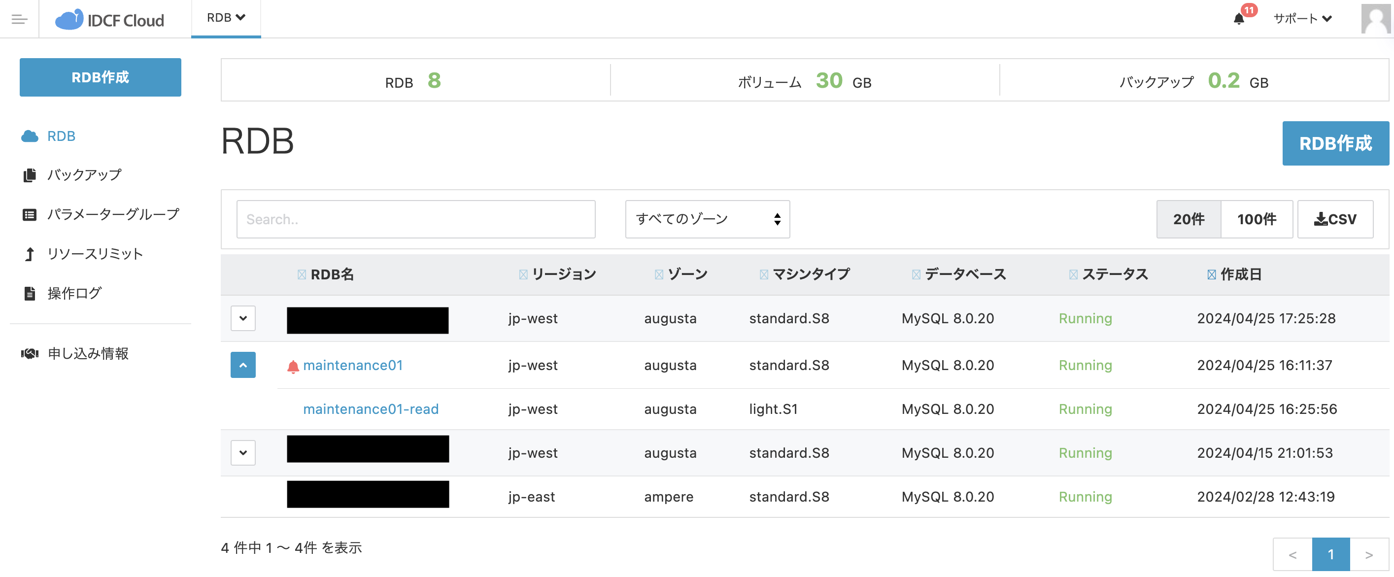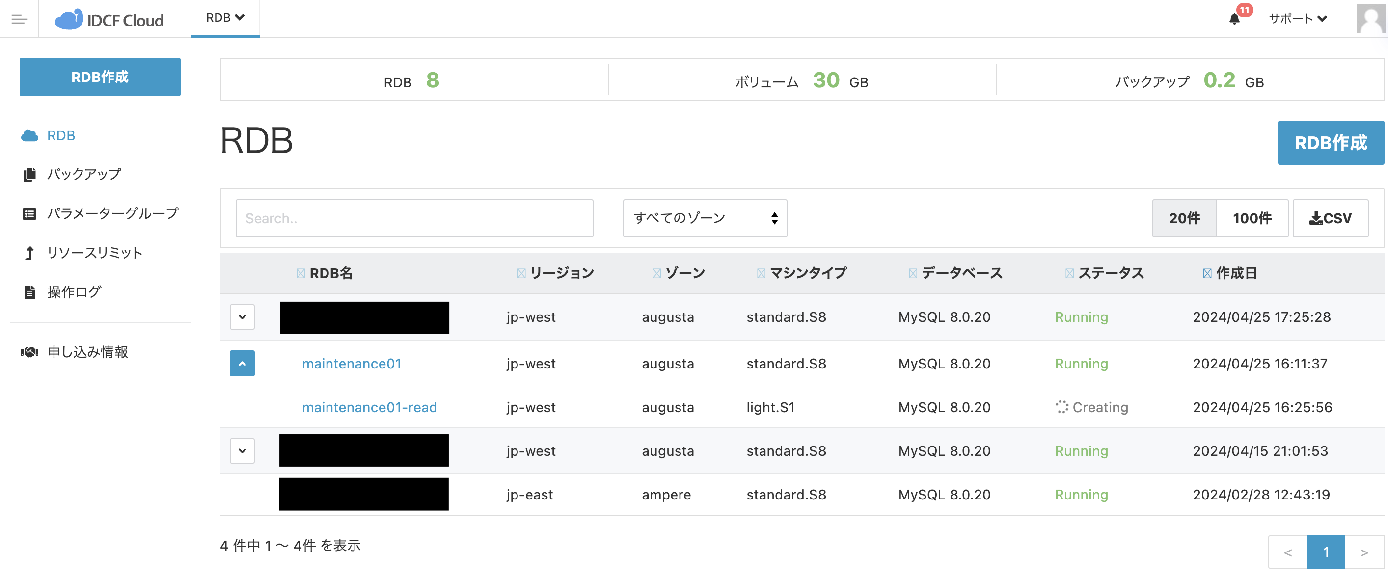 上記全てが完了した後にRDBのステータスがrunningとなるとメンテナンス1は完了となります。