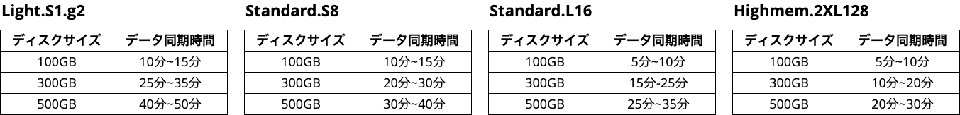 メンテナンス1のデータ同期時間の目安は下記のようになっております。
