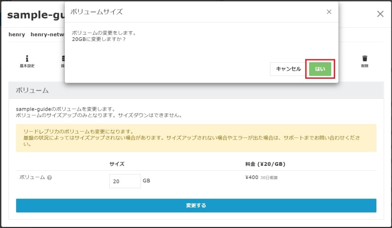 変更したいボリュームサイズを入力し、「変更する」をクリックします。(1GB~1,000GB)