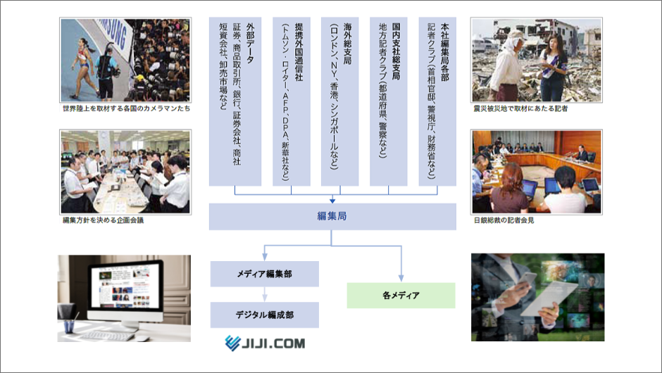 本社編集局に集約されたこれらの素材は、デスクによるチェックや整理部によるダブルチェックを経て、各メディアへ配信されます。 インターネット向けのコンテンツは、記事や写真を専用のフォーマットに編集し、関連情報を付加した上で、時事ドットコムやポータルサイト等に配信されています。
