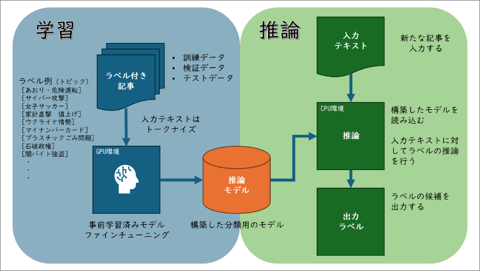 日本語の事前学習済み大規模言語モデル(LLM)に対して、これまでにデスク(編集者)が手動で分類したデータを用いてファインチューニングを行い、記事を分類するモデルを作成します。