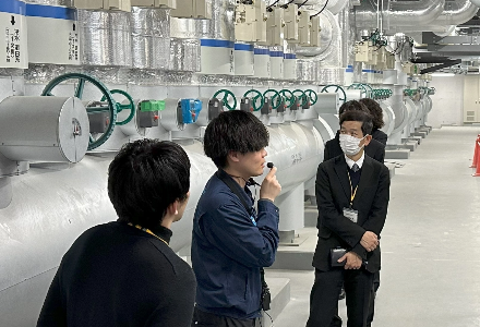 まずは、データセンターの安定稼働を支える電気・空調設備のフロアからスタートし、電力供給会社から66,000Vの特別高圧で受電する巨大な変圧器を前にして、参加者の方々は普段見たことのない設備に興味津々です。
