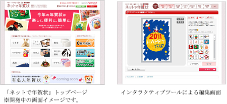 インターネット上で選んだ年賀状デザインに、ペンやスタンプなどのツールでデコレーションし、そのまま紙の年賀状を印刷・投函・配達(あるいは、購入)ができるサービスです。年賀状づくりの「選ぶ」、「つくる」、「送る」、「買う」のすべてを、インターネットで楽しく簡単に行えます。販売開始は11月15日からです。